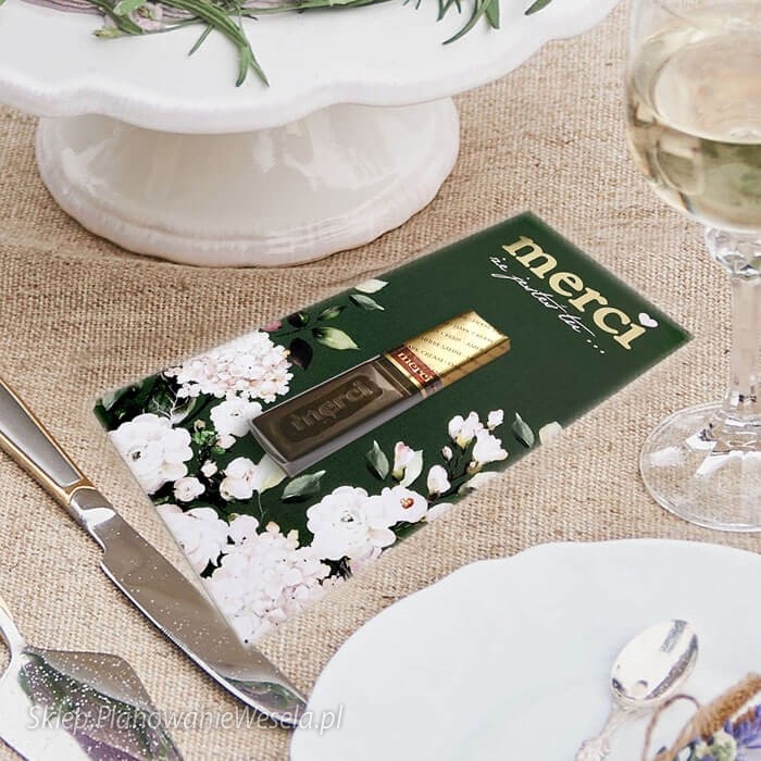 Oryginalny pomysł na podziękowanie gościom w formie podkładki do czekoladek. Podziękowanie wykonane ze sztywnego białego papieru z precyzyjnym drukiem cyfrowym w najmodniejszej kolorystyce tego sezonu.