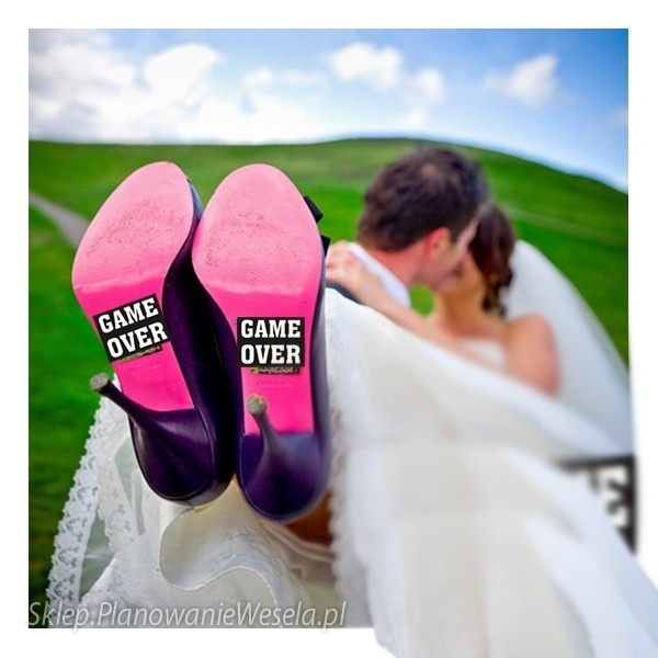 Zabawne naklejki samoprzylepne na podeszwy butów Młodej Pary.