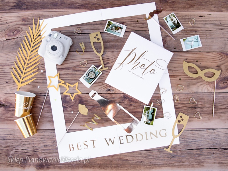 Zestaw z ramką do selfie, zestaw zawiera: białą ramkę ze złotym napisem Best Wedding (wymiary po złożeniu ok. 50 x 59,5 cm, 1 szt.), gadżety do zdjęć w kolorze złotym (wysokość po złożeniu ok. 21 – 42 cm, 8 szt.), transparentne balony w złote serca (rozmiar ok. 30 cm, 3 szt.) i ok. 3 m złotego sznurka.