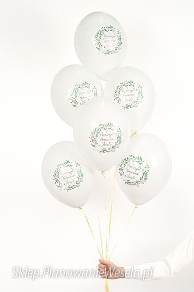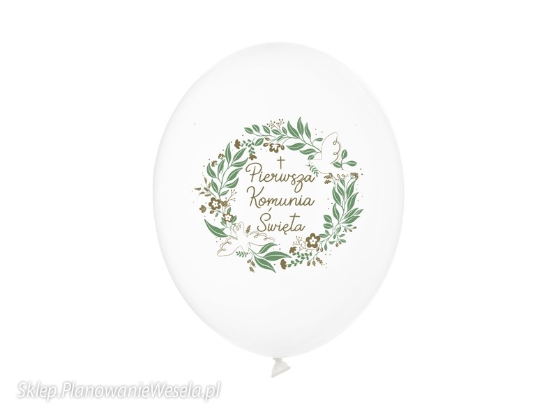 Balony Strong ''Pierwsza Komunia Święta'', zestaw zawiera 6 balonów w kolorze Pastel White z kolorowym dwustronnym nadrukiem, średnica ok. 30 cm.