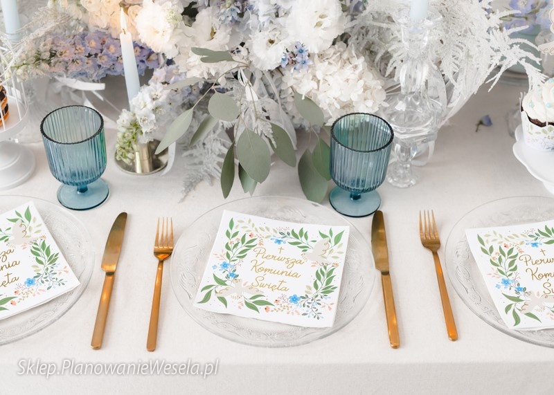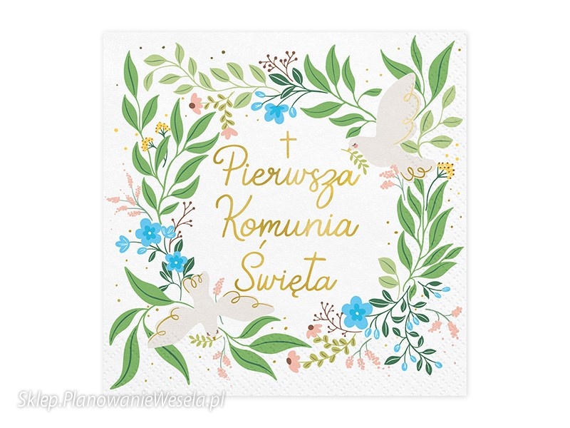 Serwetki papierowe w kolorze białym z kolorowym nadrukiem i złotym metalizowanym napisem ''Pierwsza Komunia Święta'', wymiary po rozłożeniu ok. 33 x 33 cm, wymiary po złożeniu ok. 16.5 x 16.5 cm.