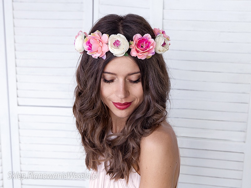 Wianek z kwiatami w kolorach białym i różowym, średnica ok. 17 cm.