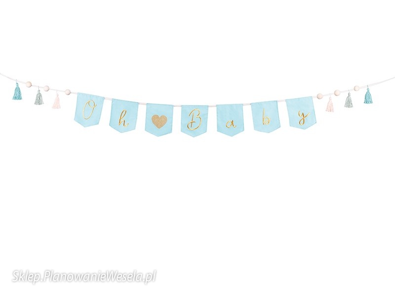 Baner Oh baby w kolorze błękitnym ze złotym napisem i frędzelkami, długość ok. 2.5 m. Produkt do samodzielnego złożenia.