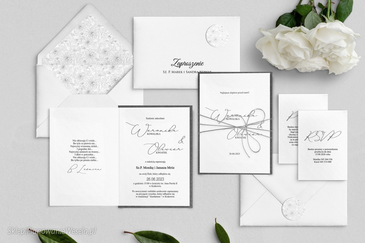 Dodatki do zaproszenia widoczne na zdjęciach tj. kolorowa podklejka pod zaproszeniem, aplikacja(wstążka, sznurek), dodatkowa wkładka, koperty kolorowe z zaklejką lub wklejką wewnątrz nie są w cenie zaproszenia. Należy je zamówić dodatkowo.