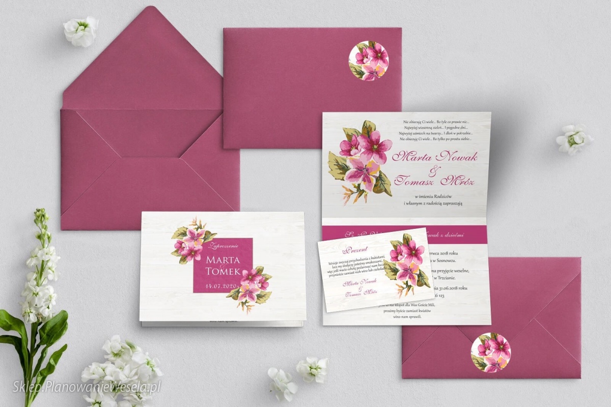 Dodatki do zaproszenia widoczne na zdjęciach tj. kolorowa podklejka pod zaproszeniem, aplikacja(wstążka, sznurek), dodatkowa wkładka, koperty kolorowe z zaklejką lub wklejką wewnątrz nie są w cenie zaproszenia. Należy je zamówić dodatkowo.