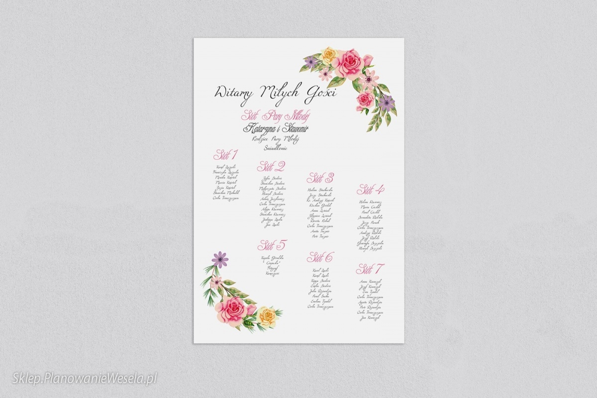 Plan stołów weselnych z piękną rozpiską gości, w pełni personalizowany.