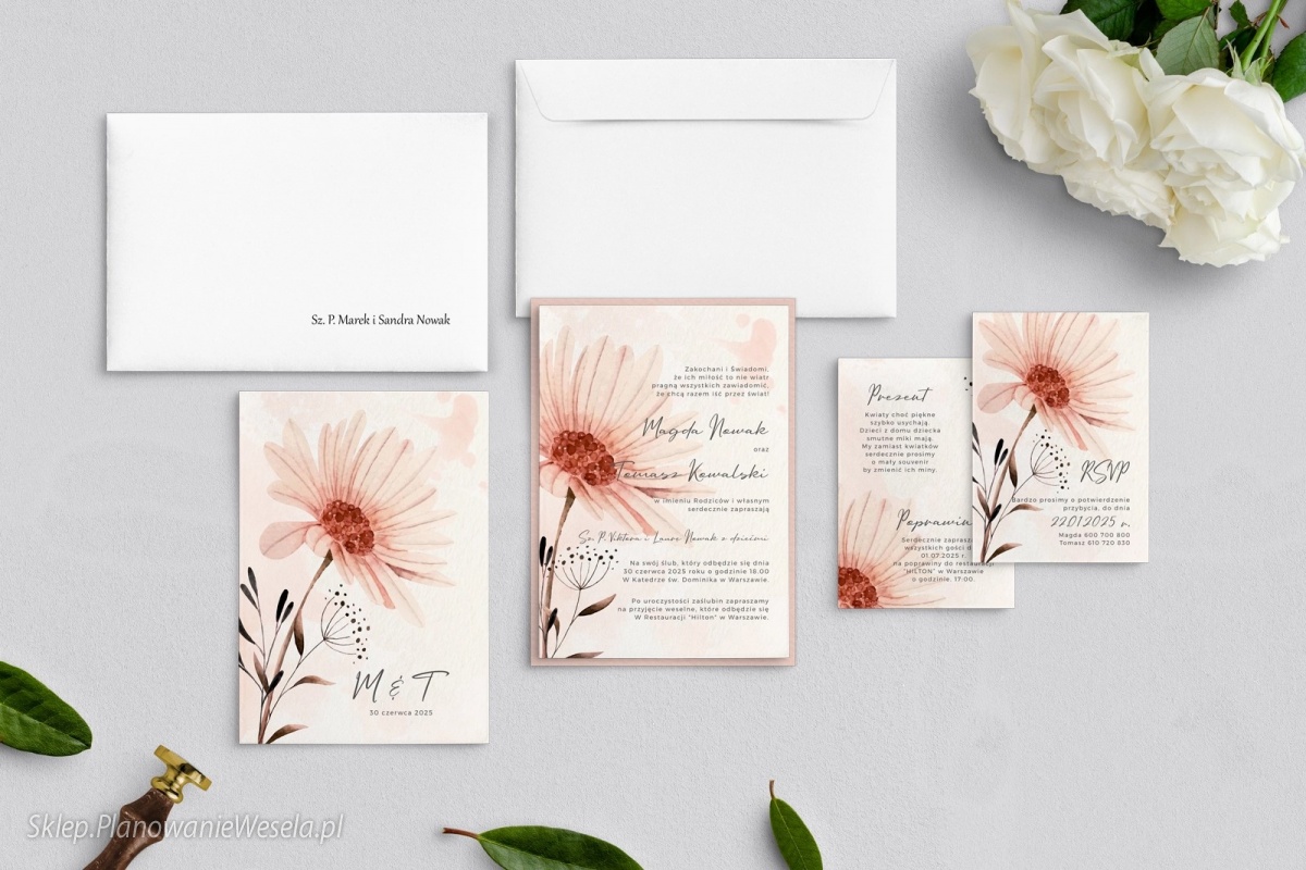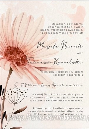Na zaproszeniu jest miejsce na informację o ślubie oraz o przyjęciu weselnym.