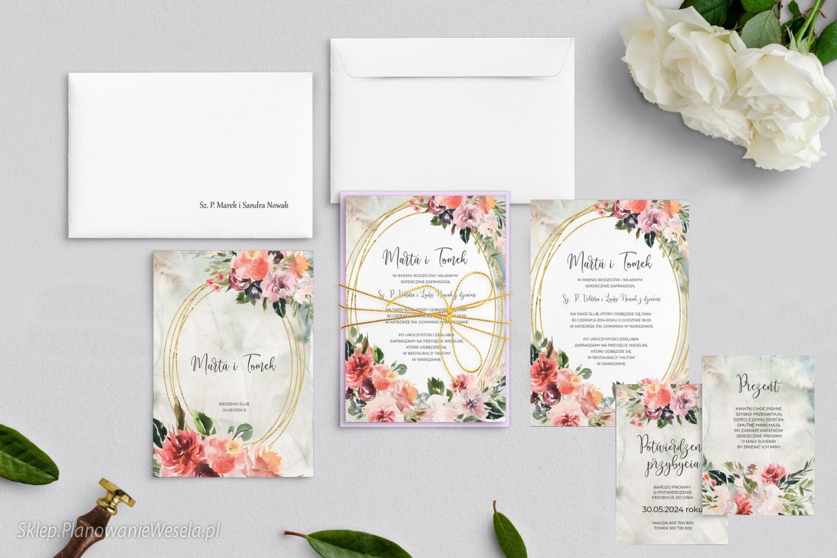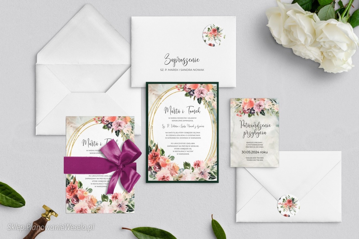 Na zaproszeniu jest miejsce na informację o ślubie oraz o przyjęciu weselnym.