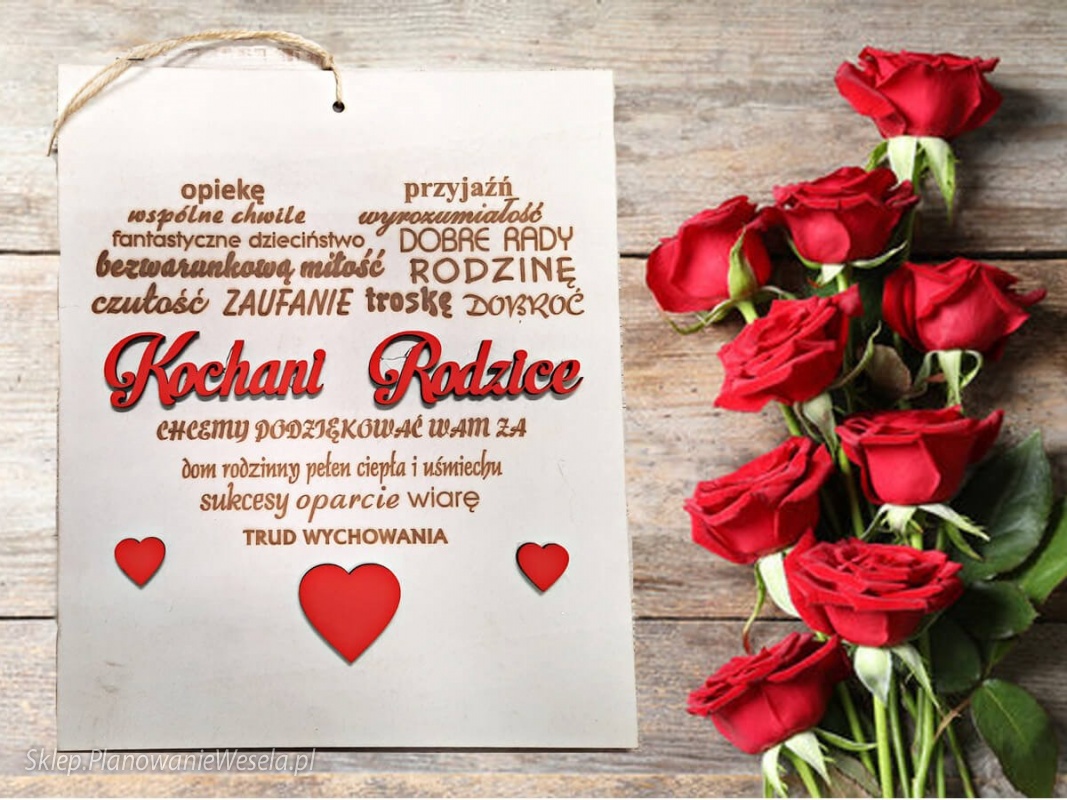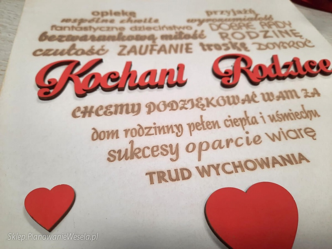 Tło pomalowane na biało, tekst grawerowany i dodatkowo dla efektu 3d naklejony napis w czerwonym kolorze Kochanym Rodzicom oraz serduszka.